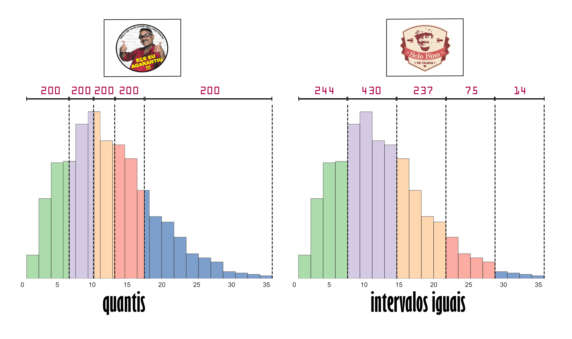 É importante realçar a diferença de abordagem desses dois métodos. A por quantis se propõe a alocar uma mesma quantidade de observações por classe, independentemente da amplitude dessas. Enquanto a segunda preza pelo estabelecimento de classes com intervalos de mesma grandeza, sem ter o compromisso com o quantitativo de observações vinculadas a cada uma delas. De fato, esse método pode gerar classes sem nenhuma observação vinculada.