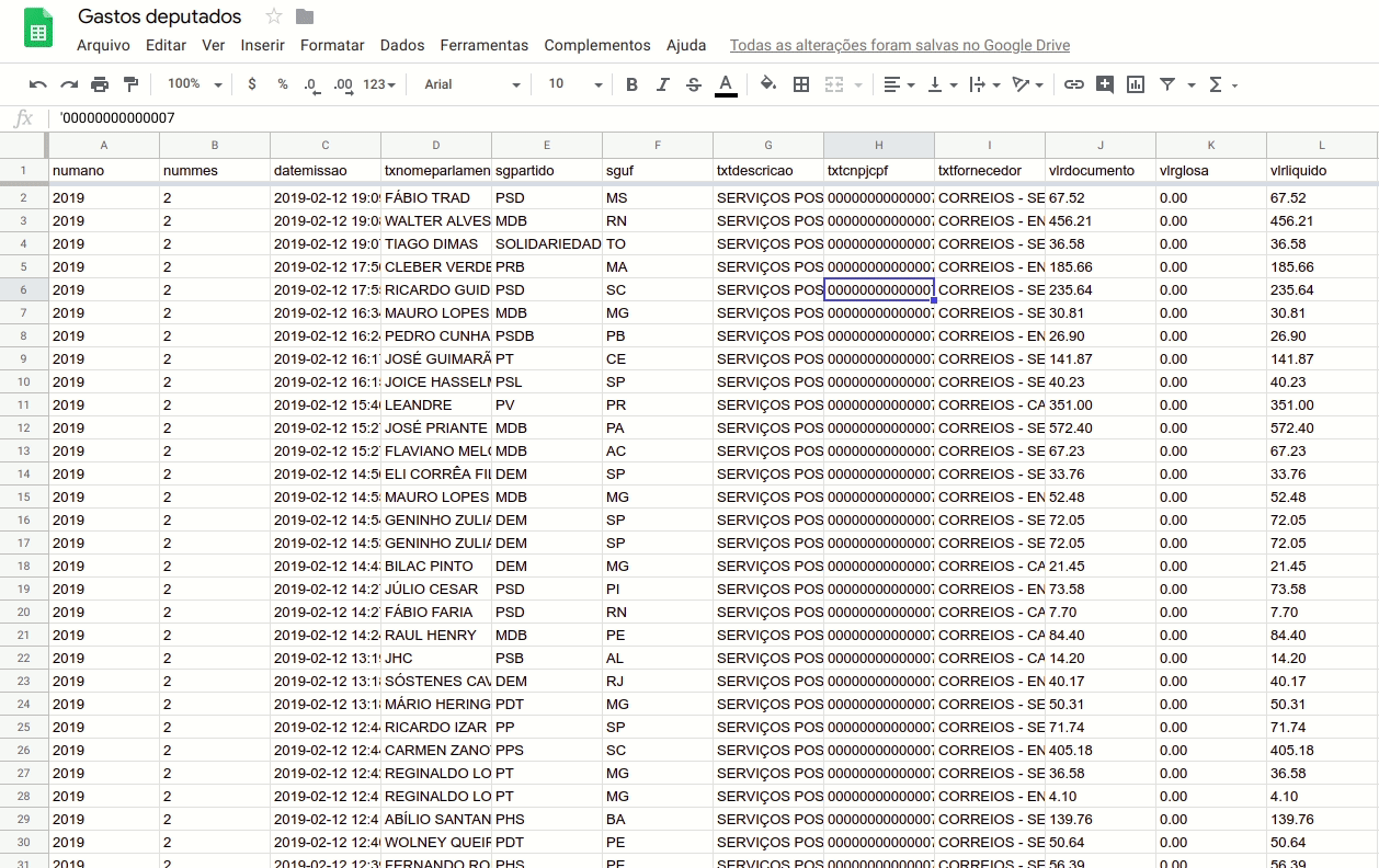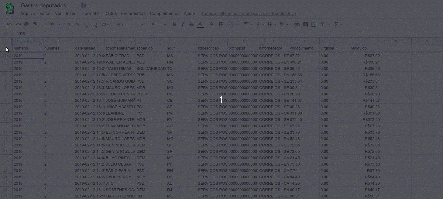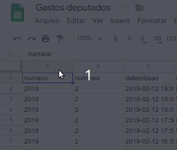 Para facilitar, vamos usar o site Brasil.io, que coletou e estruturou a série histórica de dados da Câmara. Através dele, em poucos segundos, podemos filtrar e exportar apenas os resultados de 2019 em um formato CSV, mais adequado para abrirmos com um editor de planilhas.