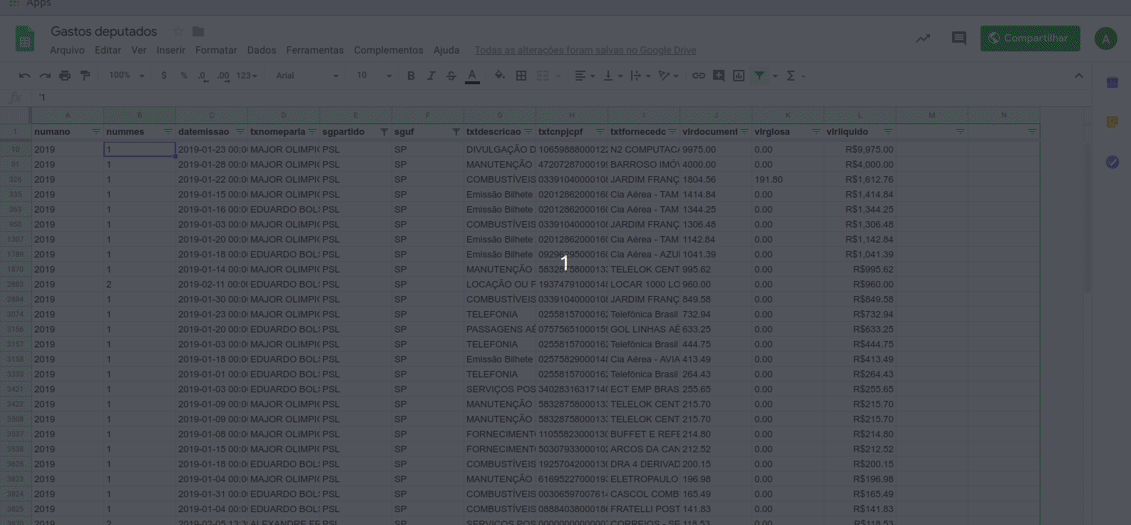 Ou seja, para saber o maior valor pago em despesas de deputados do partido da situação (PSL) em São Paulo, eu preciso filtrar a coluna “sguf” pelo valor “SP”, a coluna “sgpartido” pelo valor “PSL” e, na sequência, ordenar os dados pela coluna “vlrliquido”.