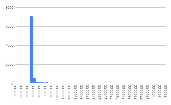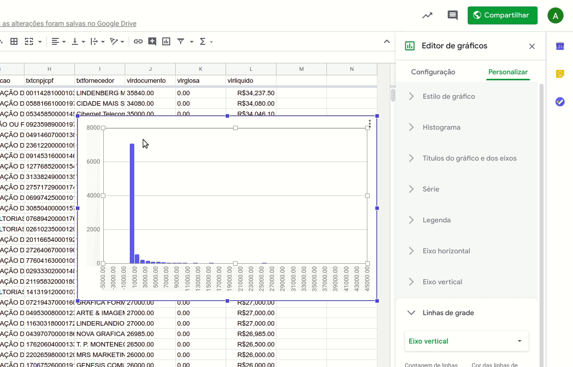 Veja que os primeiros valores do eixo horizontal são negativos. Ou seja, existem alguns registros com números negativos no campo “valor líquido”. Para identificar se estes valores são erros ou registros reais, além de entender mais a fundo a metodologia de registro dos dados, poderíamos ordenar toda tabela por sua última coluna, de forma crescente. Assim, ficaria fácil identificar estes casos e investigá-los.