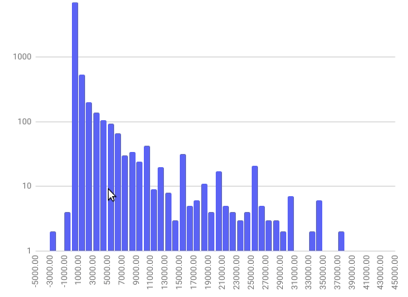 Passando o cursor sobre as barras, é possível ver quantas despesas estão registradas em cada faixa. No nosso caso, por exemplo, há 42 despesas entre R$ 10 e R$ 11 mil registradas nos dados.