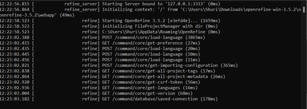 O Open Refine funciona a partir do seu navegador. Ao executá-lo, você verá um terminal iniciando um servidor local que irá garantir o funcionamento do programa. Fechar a janela do terminal faz o servidor parar, consequentemente o Open Refine suspender suas funções, ainda que permaneça aberto no navegador. Caso a janela do seu navegador não abra automaticamente, procure por um endereço parecido com este ‘127.0.0.1:3333′ entre as mensagens do terminal e digite-o em seu navegador.