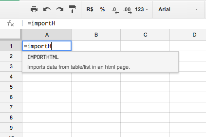 Crie uma tabela em branco no Google Sheets e comece a digitar =importHTML na primeira célula. Veja que você vai digitando a fórmula e o Sheets já autocompleta para você.