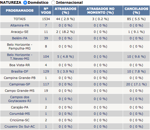 Para raspar os dados mais atualizados da Infraero em relação aos voos atrasados ou cancelados no Brasil, tiramos as informações dessa tabela aqui:
