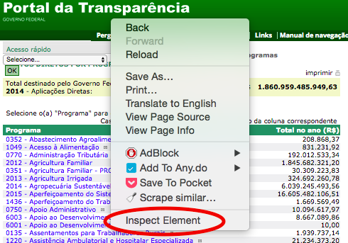 Vai lá no portal da transparência. Vamos escolher os Gastos Diretos do Governo, por programa, no ano de 2014.