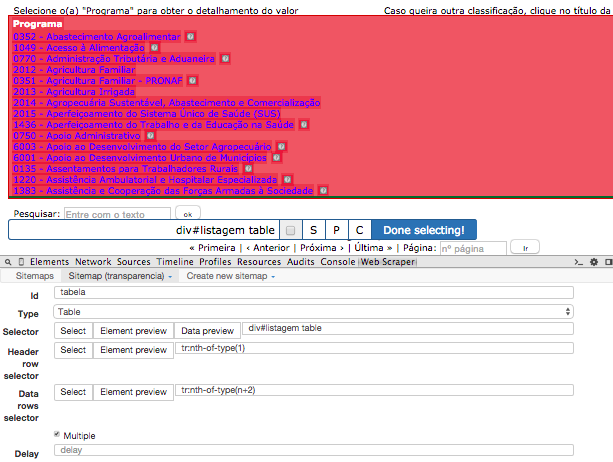 Está tudo certo, a coluna dos programas está aí e dos valores gastos também. Agora é só clicar em Sitemap (transparencia) e depois em Scrape.