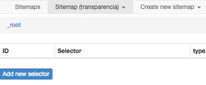 Agora, clique no botão azul para criar o robô. Por enquanto ele estará sem nenhuma atribuição, seria um robô de raspagem “vazio”. Clique no botão Add new selector agora para gente poder começar a adicionar os elementos que vamos raspar.