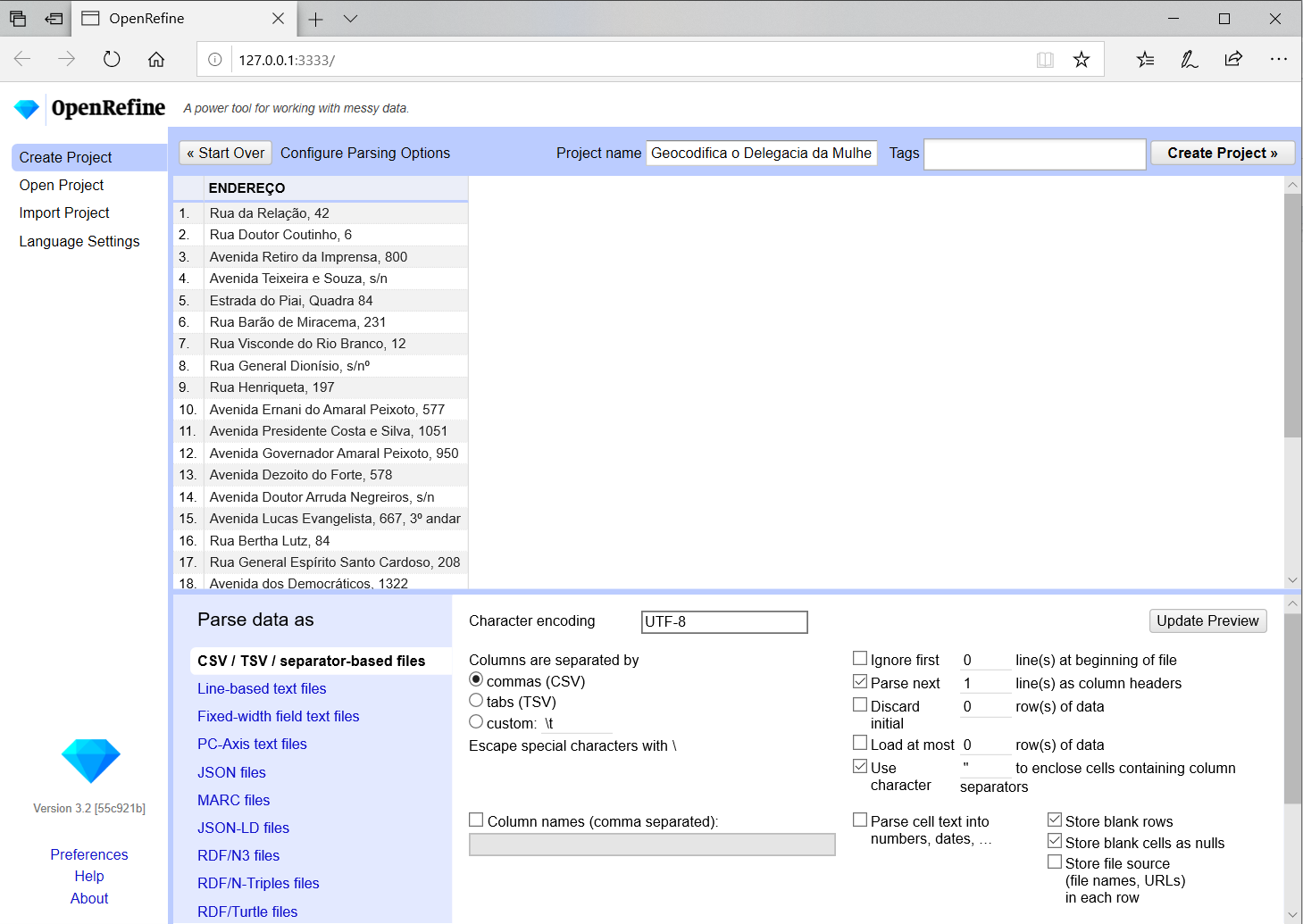 Importando os dados no Open Refine