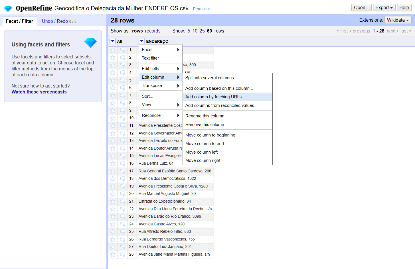 Já entendemos como funciona a API que iremos usar. Agora vamos botar a mão na massa. Se você tiver dificuldades para instalar ou executar o Open Refine, primeiro leia a documentação oficial do projeto e, se mesmo assim não conseguir resolver, poste uma dúvida no forum.jornalismodedados.org. Como o processo é relativamente simples, iremos focar aqui na parte da geocodificação.