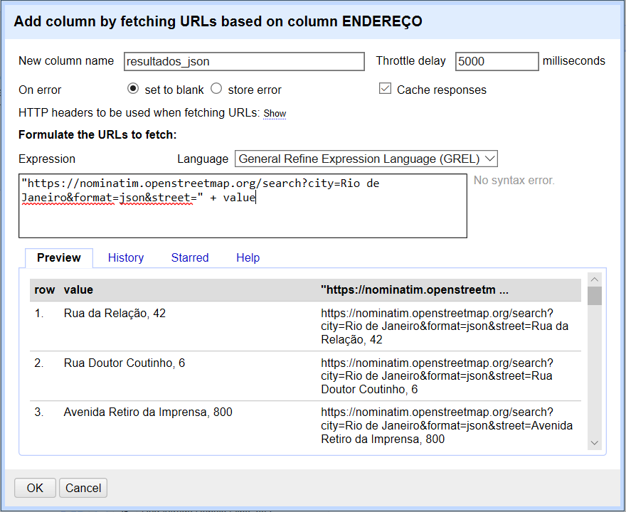 2. Na coluna do campo de “Endereço”, selecione a opção “Edit column” > “Add column by fetching URL”. Insira o texto abaixo no campo ‘Expression’, alterando os textos em negrito. Acompanhe o tutorial para saber mais sobre os parâmetros de busca.