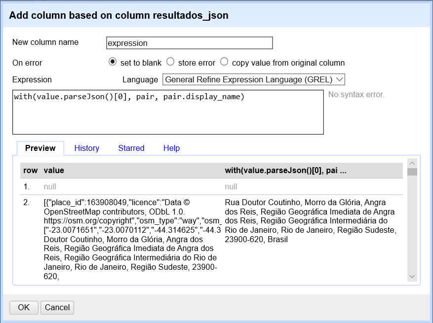 Depois de dar “OK”, o Open Refine irá começar a consultar a API e obter os resultados. Este processo pode demorar, a depender do número de registros da sua tabela.