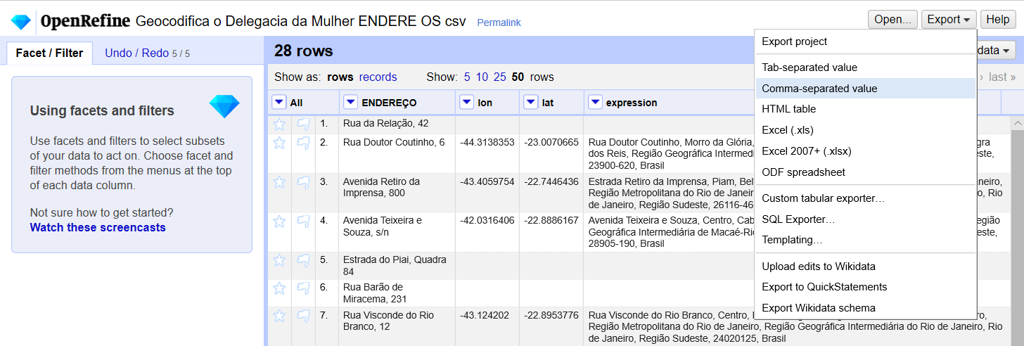 Por fim, precisamos exportar os dados do Open Refine (Export > Comma-separated value) e transformar este CSV em um arquivo de dados geográficos (GeoJSON).