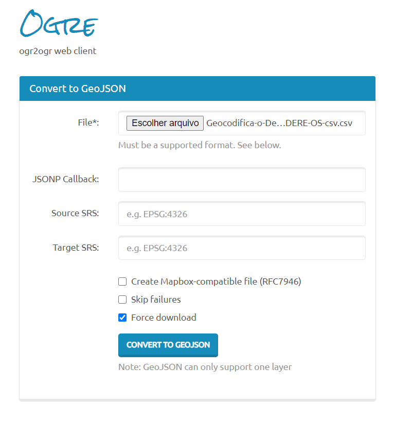 Para converter um CSV para GeoJSON, vamos utilizar um serviço online, o Ogre, que é gratuito e não exige registro. Basta subir o arquivo CSV criado no campo “File” da seção “Convert to GeoJSON”. Marque a opção “Force Download” e clique no botão “Convert to GeoJSON”.