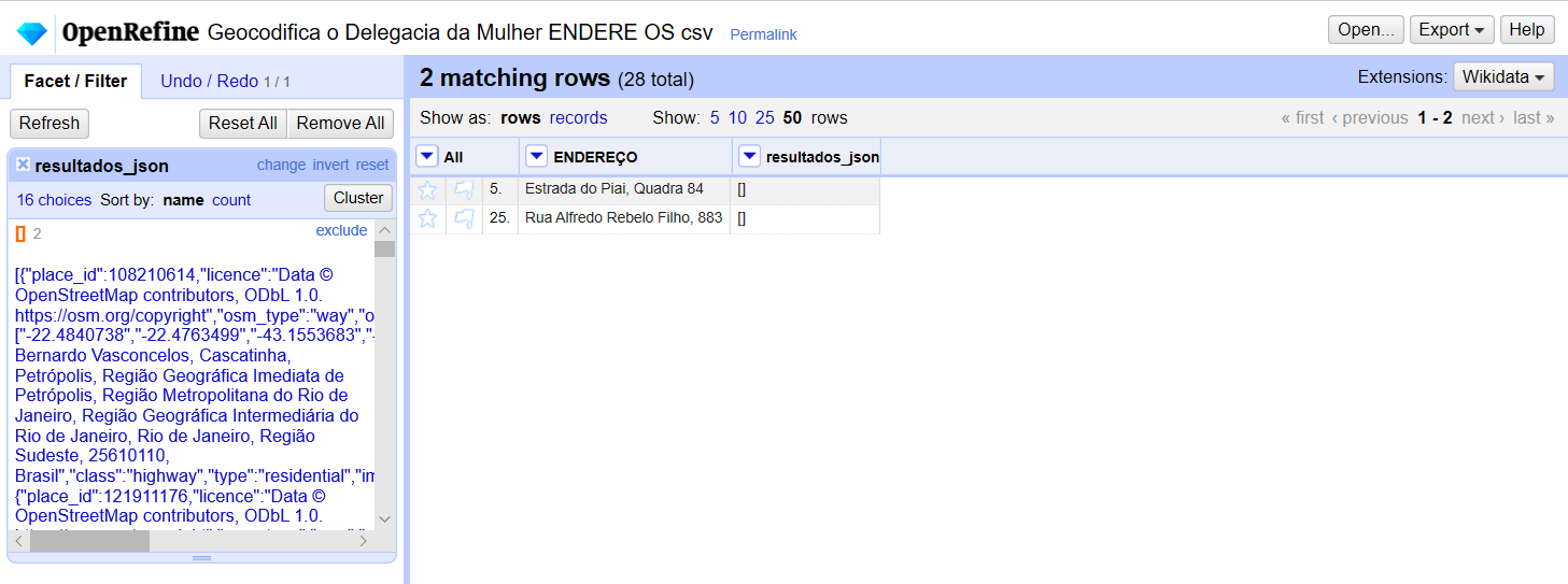 Do lado esquerdo, selecione a opção com colchetes vazios (“[]”) para filtrar apenas os resultados onde a geocodificação falhou. No nosso exemplo, dos 28 endereços, em apenas 2 a consulta não prosperou.
