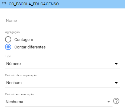 Repare que as opções do campo ‘Métrica’ agora mudaram. Clique em CTD e escolha a opção ‘Contagem diferentes’. Assim, o Data Studio contará apenas os códigos que não se repetem. Você pode aproveitar e trocar o campo ‘Nome’ para algo como ‘Total de escolas’, se quiser.