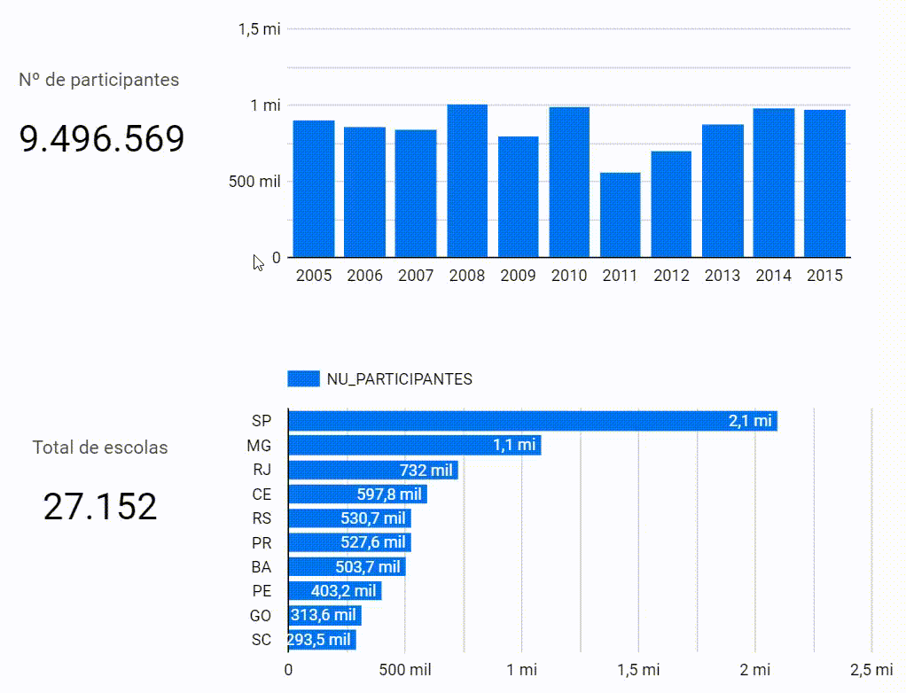 O que torna o dashboard interessante é o fato dos gráficos interagirem entre si. Essas interações funcionam como um filtro possibilitando fazer recorte de informações por ano, estado, etc.