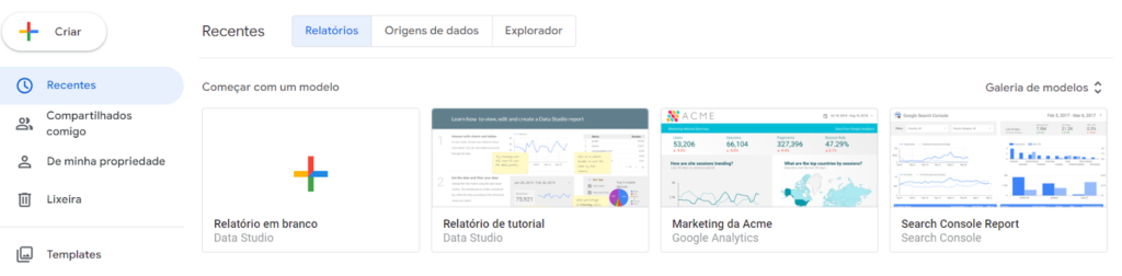Para começar, faça login na sua conta do Google e acesse a plataforma utilizando o endereço: datastudio.google.com. Na tela inicial, vamos clicar em Relatório em branco.