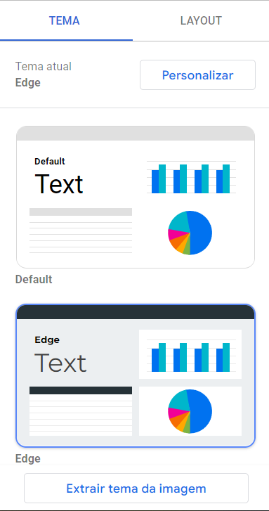 Na aba ‘Tema’, o Data Studio oferece algumas opções de tema predefinidos e ainda a opção para criar um a partir da paleta de cores de uma imagem, na opção ‘Extrair tema da imagem’. Isto pode ser útil para aproveitar a identidade visual de uma arte de sua empresa, por exemplo, a fim de definir algumas cores que farão parte do tema do seu painel de visualização de dados. Já na aba ‘Layout’ é possível definir as configurações da página do dashboard.