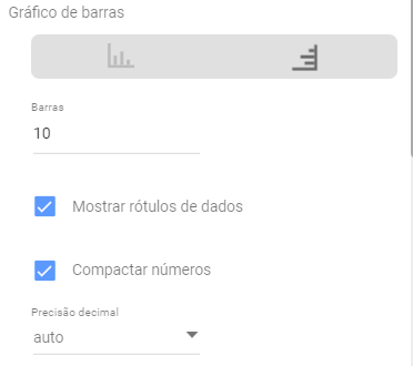 Depois, vamos colocar número de participantes dentro da barra dos gráficos. Na aba ‘Estilo’ no campo ‘Gráfico de barras’, tem a caixinha ‘Mostrar rótulos de dados’, marque-a. Marque também a caixa ‘Compactar números’, logo abaixo, para que os números sejam arredondados.