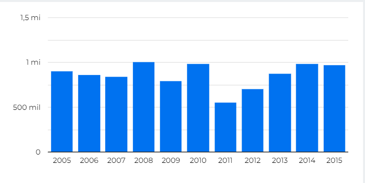 Nesse gráfico temos alguns questões para serem aperfeiçoadas: os anos estão desordenados, só aparecem os anos até 2014 (quando temos também o ano de 2015) e há uma legenda que poderia ser removida. Vamos resolver isso com os passos a seguir.
