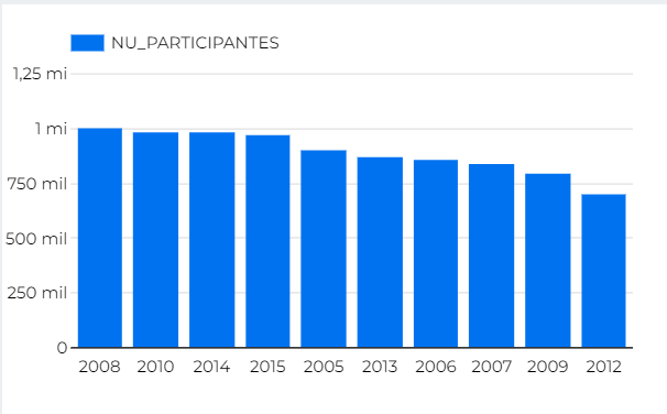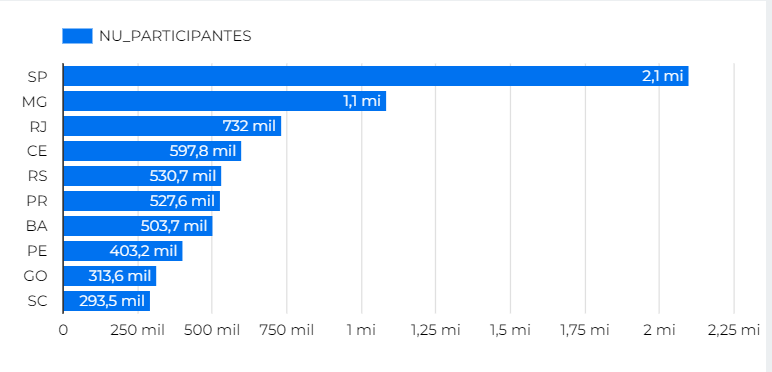 Seu gráfico deve ficar semelhante a este abaixo. Se você quiser exibir todas as unidades da federação, troque o número “10” por “27” no item “Barras”. Se preferir, a partir dos passos descritos anteriormente, você poder personalizar ou remover a legenda (NU_PARTICIPANTES).