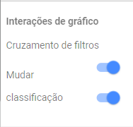 Para habilitar essas interações, clique em qualquer gráfico para a aba ‘Dados’ aparecer. Nessa aba, procure o campo Interações de gráfico, na parte inferior da aba. Você verá duas opções para cruzamento de filtros: Mudar e Classificação. Habilite as duas, caso ainda não estejam habilitadas. Repita o mesmo passo para todos os gráficos que você deseja utilizar como filtros.