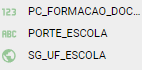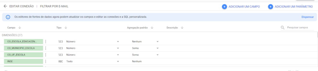 A ‘Métrica’ será CO_ESCOLA_EDUCACENSO. O número que aparece é a soma de todos os códigos, isso porque o tipo de dado desse campo é número e não texto. Você consegue ver o tipo de dados ao lado dos campos, na aba dados.