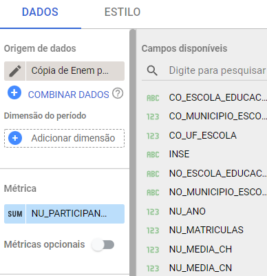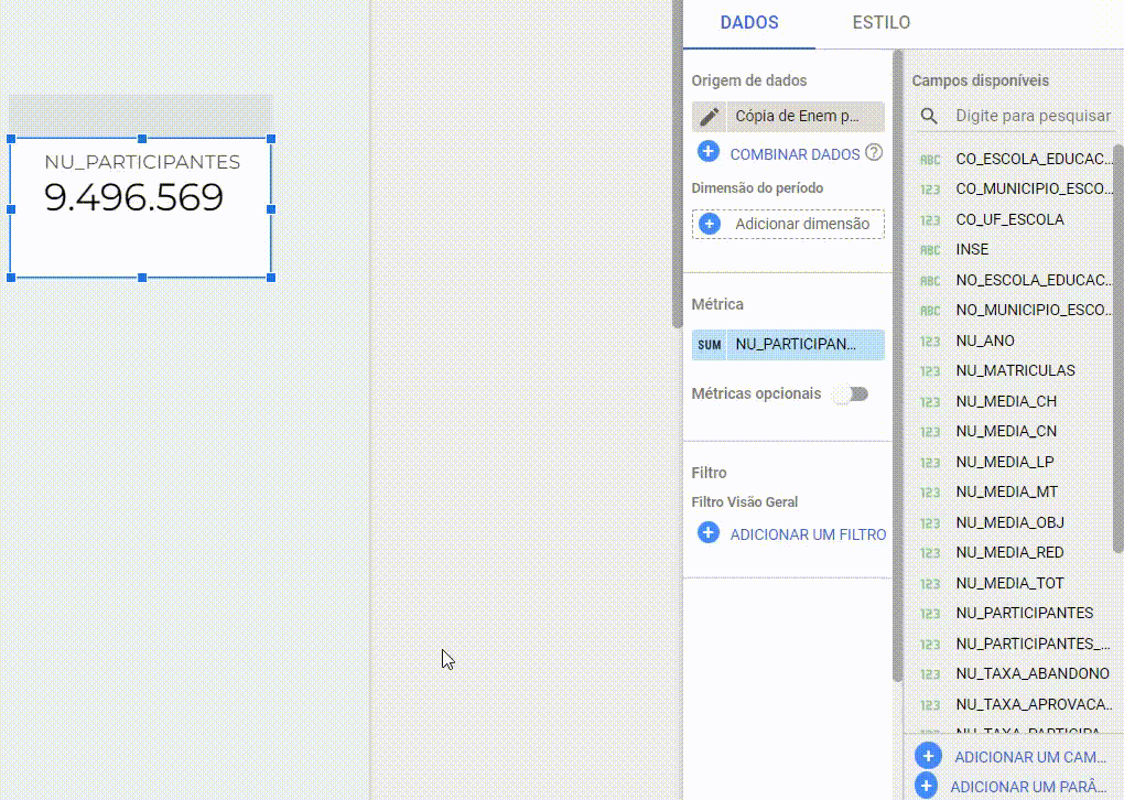 No lado direito da tela, novas opções irão aparecer. Na opção ‘Campos disponíveis’, aparecem todas as colunas do arquivo de dados que você importou. Procure pelo campo NU_PARTICIPANTES. Basta clicar e arrastar para o campo Métrica, ao lado.