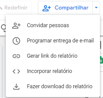 Tanto no menu Arquivo, quanto no lado superior direito, você encontra opções para compartilhar o relatório para edição ou visualização com outra pessoa, fazer download ou incorporar em um site ou documento via HTML.