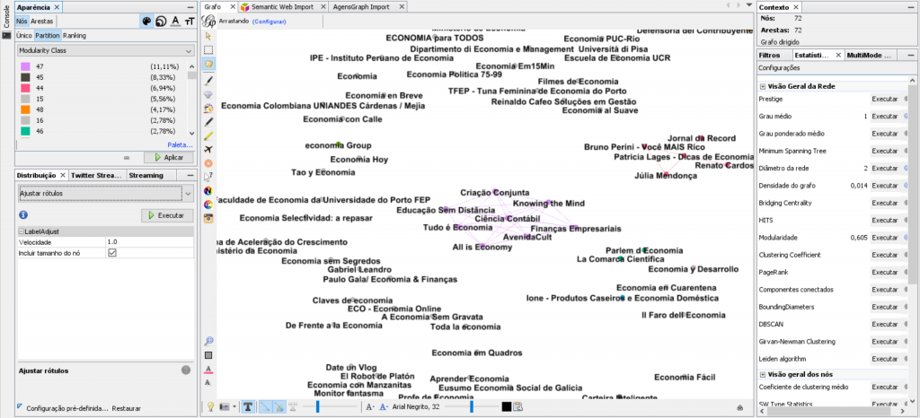 Você pode experimentar e executar diferentes estatísticas do grafo para suas análises. Por ser um tutorial introdutório, não iremos explorar todas possibilidades e vamos direto àquela que nos interessa, a de Modularidade, um algoritmo de detecção de comunidades. Selecione esta opção no menu ‘Estatísticas’, clique em Executar, mantenha as configurações padrão e em seguida dê OK. Será apresentado um relatório com o resultado obtido e também uma nova coluna será adicionada aos seus dados.