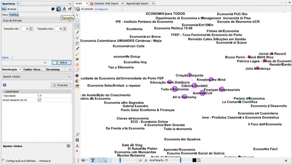 Para conseguirmos visualizar isso no grafo do nosso tutorial, podemos aplicar a seguinte configuração para que o tamanho dos círculos sejam proporcionais ao seu grau de entrada: Aparência > Nós > Tamanho > Ranking > Grau de Entrada > Tamanho mínimo: 10 e Tamanho máximo: 30.