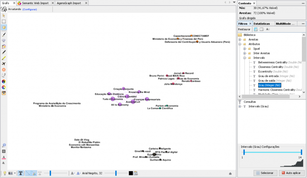 Nem sempre todos os nós de um grafo terão arestas. Por exemplo, no arquivo que geramos há canais que aparecem como resultado da busca, porém, não fazem parte de uma rede de canais pois não citam, nem são citados por nenhum outro. Se quisermos fazer o exercício de filtrar o grafo, para deixar apenas os nós que possuem alguma aresta, basta selecionar o menu Filtros > Atributos > Topologia > Intervalo de grau.