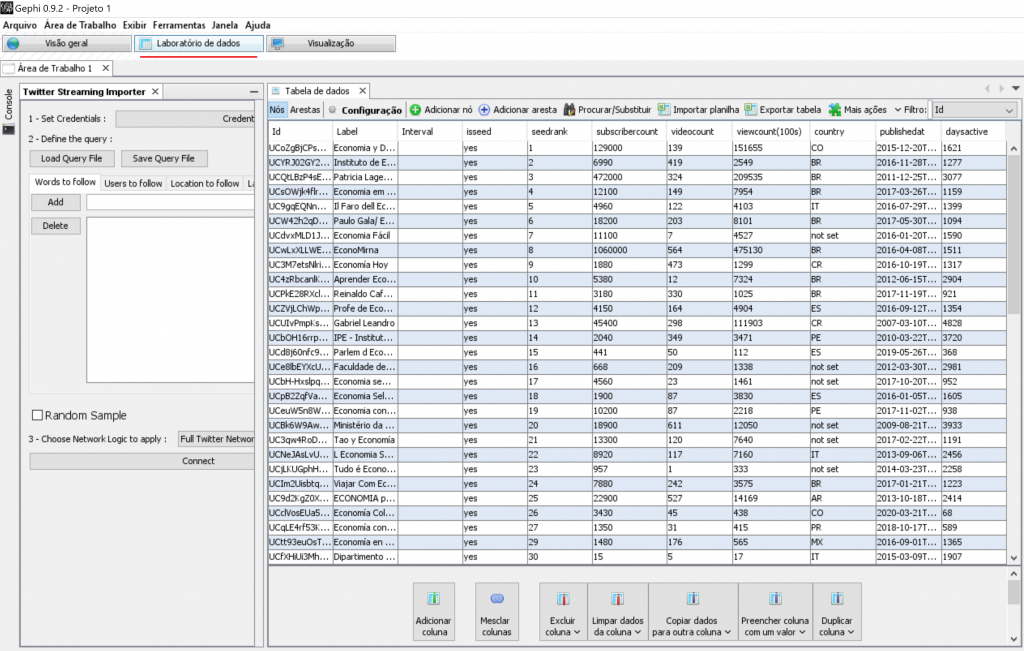 O conjunto que usaremos como exemplo foi gerado com uma busca pela palavra-chave “Economia”, em maio de 2020. Como o arquivo foi gerado para fins didáticos, nós utilizamos todos os recursos da ferramenta para obter o número de registros possíveis. Estes dados contém apenas uma amostra bem pequena do total de canais relacionados a esta palavra-chave no YouTube, mas irá servir para compreendermos como baixar estas informações, analisá-las e visualizá-las no Gephi. Para facilitar, vamos disponibilizar o arquivo que será usado mais adiante no tutorial e, se quiser, você pode baixar aqui o arquivo e pular esta etapa.