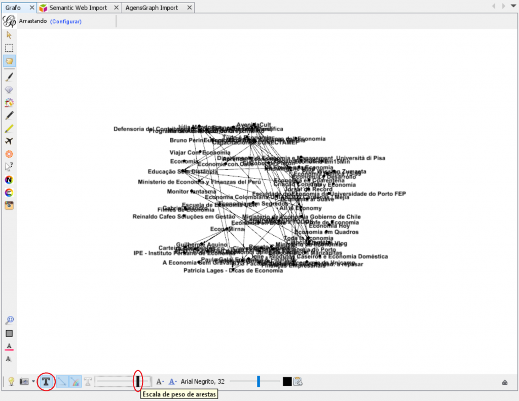 Para começar a explorar nosso exemplo, vamos mostrar os rótulos dos nós, ou seja, os nomes dos canais. Podemos fazer isso clicando no ícone com um “T” de texto, destacado com o círculo vermelho abaixo.