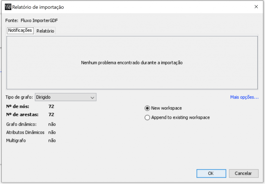 Como você pode observar, já nesse momento o Gephi fornece algumas informações sobre o grafo: ele é do tipo dirigido, possui 72 nós e 72 arestas. Mantenha as configurações padrão e dê OK. Em seguida, você verá o conjunto de dados já em sua visualização de grafo.