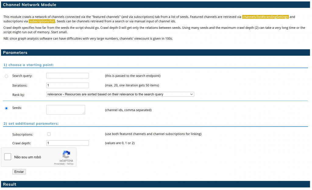 Você também pode escolher a profundidade do rastreamento (crawl depth). A profundidade 0 retorna apenas as relações entre os canais listados como “sementes”/seeds. Se for um, para cada resultado, ele irá repetir o processo de busca, expandindo assim a rede. Se for dois, o processo será repetido também para os canais resultados da busca anterior, resultando assim em uma quantidade muito grande de canais, que pode eventualmente até congelar o programa, conforme os desenvolvedores explicam no site.