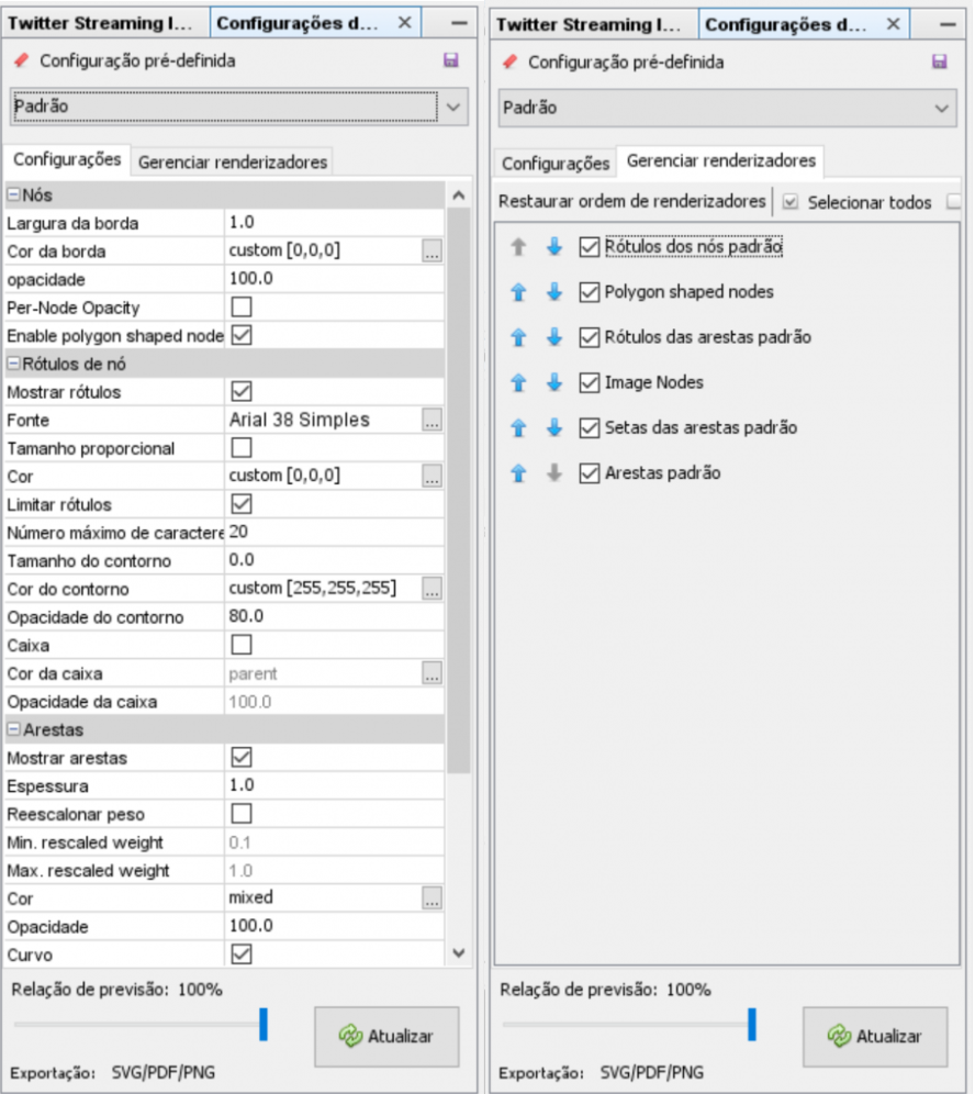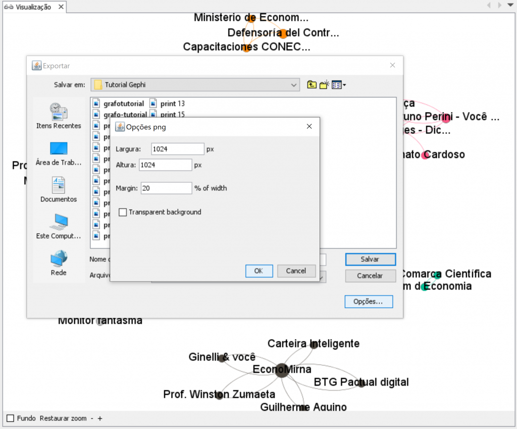 Quando você estiver satisfeita(o) com a visualização final, basta clicar em Exportação: SVG/PDF/PNG lá embaixo e exportar! Se você exportar e o conteúdo do grafo ultrapassar as margens do arquivo, tente exportar novamente com uma configuração diferente de margem. Por aqui, trocamos a % da largura de 4 para 20 e resolveu.