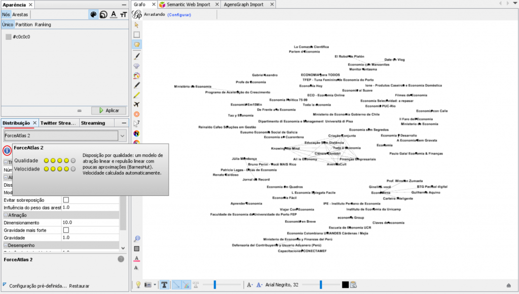 Neste tutorial, utilizamos as seguintes distribuições, uma após a outra: Force Atlas 2, Contração, Não sobrepor e Ajustar rótulos. Todas com os parâmetros padrões.